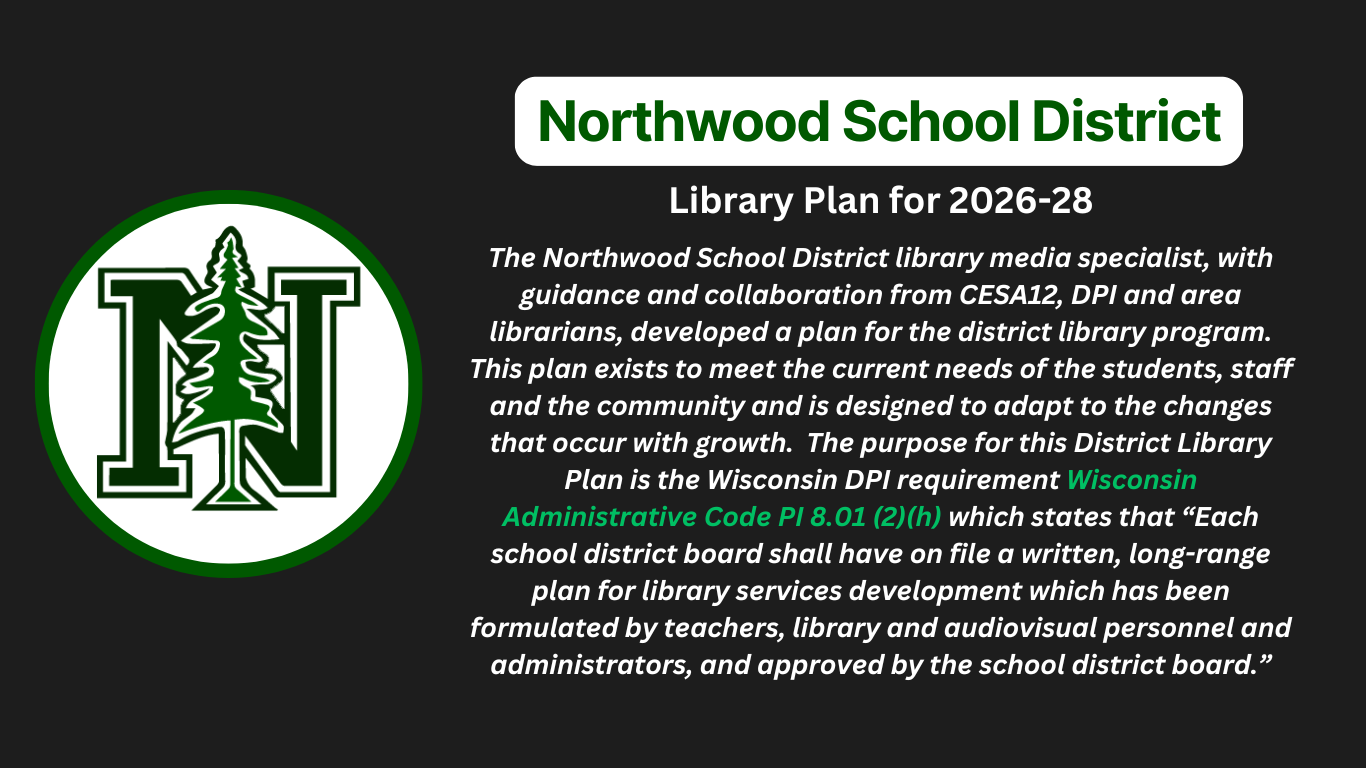 Wisconsin DPI is requiring all school library programs to create long-range plans. Click the image above to see Northwood School District's Library Plan for 2023-25.